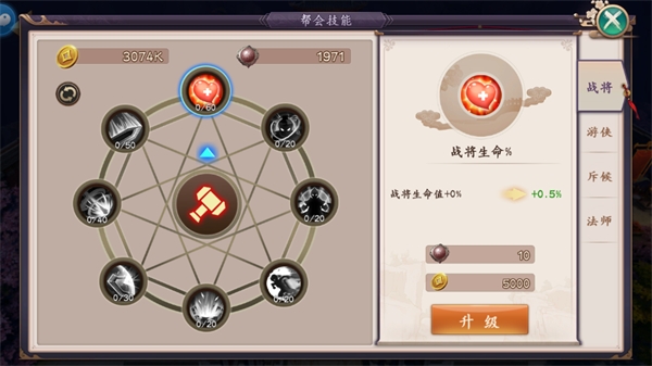 【职业大厅】在这里,帮会成员可以使用帮贡和金币,为四种职业提升帮会技能增加团队作战能力。