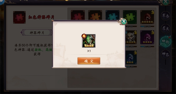 【行囊】系统分为:装备、道具、神将、神器四项存储栏。
